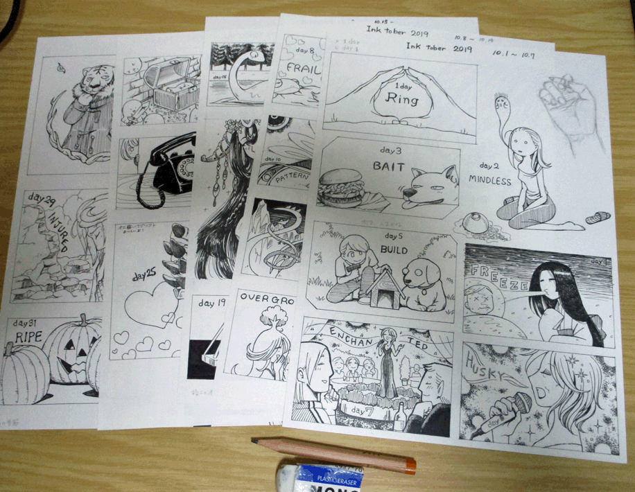 インクトーバーへの挑戦 第2回目! 絵のサイズ:4.2cm×9cm~8.9cm×11cmとまちまち 画材:スケッチブック、鉛筆、消しゴム、ボールペン、マッキー