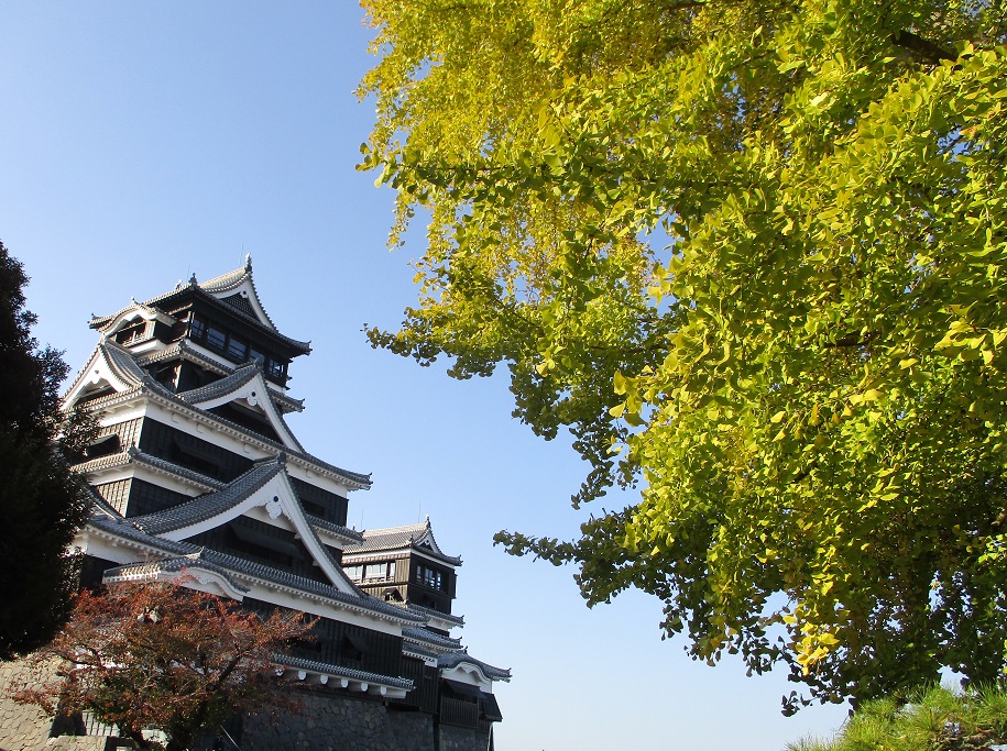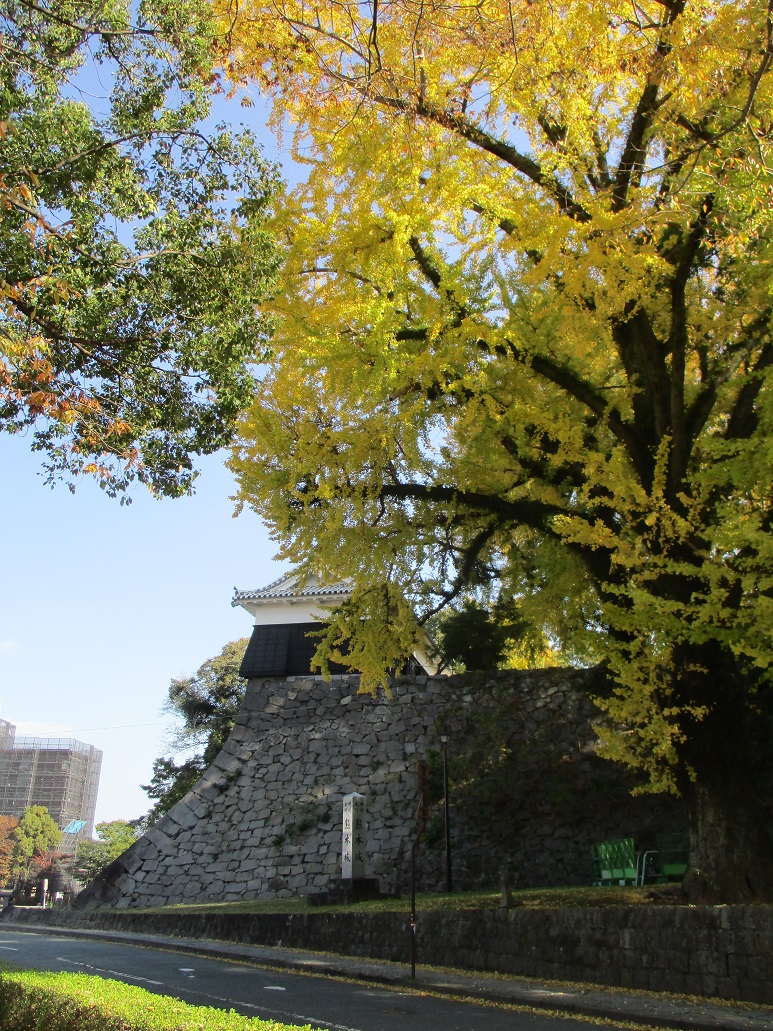 梅林側から覗く玄関屋根と傾斜した外壁 梅林側から覗く屋敷内 じっくり眺めるの久しぶりかも この辺も隠れちゃうのかな 工事には5年ほどかかる予定なのだそう。待ち遠しいなあ ついでにその周辺や天守閣前にも寄ってきました。 (実は秋限定の御城印[黒]目当てで←ゲットしたよ) 天守閣前広場の大銀杏もかなりいい色付きになってます 熊本城 大天守小天守と 監物櫓も以前の風景を取り戻していました。 (内側はまだ入れません) イチョウの色に導かれて歩き回ってたから、ヘトヘトじゃ~