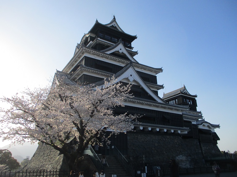 坪井川遊歩道の桜 桜が満開のようなので、熊本城まで花見に行ってきました。 気楽に出てみたらば、予想外の人の多さにびっくり・・! 若い人や外国人が多かった印象。観光客・・戻ってきたのかなあ こんなに人の多い花見いつ以来だ 未申櫓 手前に見えるのはもうすぐ解体工事にはいる宇土櫓です 見納めだなあ・・と思いながら見に来るの何回目かしら(笑) 天守閣どーん 復元工事中の飯田丸五階櫓と石垣 曇りがちな時間帯もあったけれど、青空と太陽が出ると心地よい気温 日が暮れて風が吹くと風邪をひきそうに寒い 着るものに悩む季節です