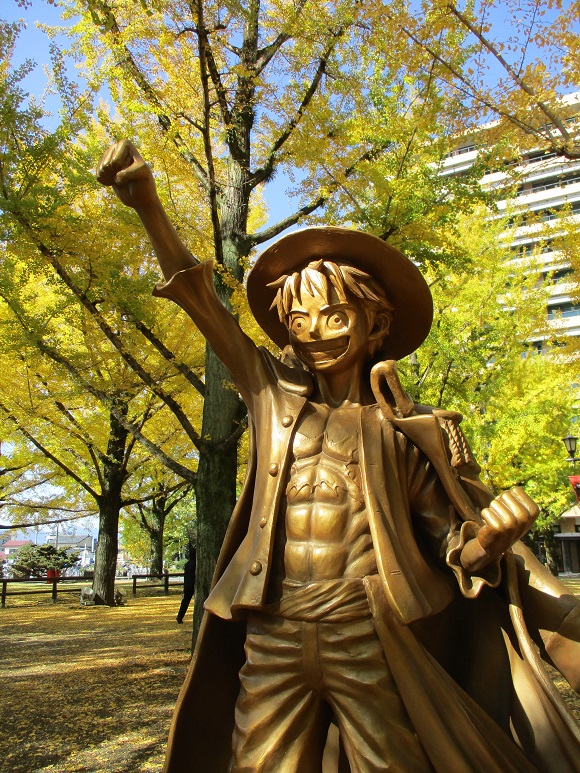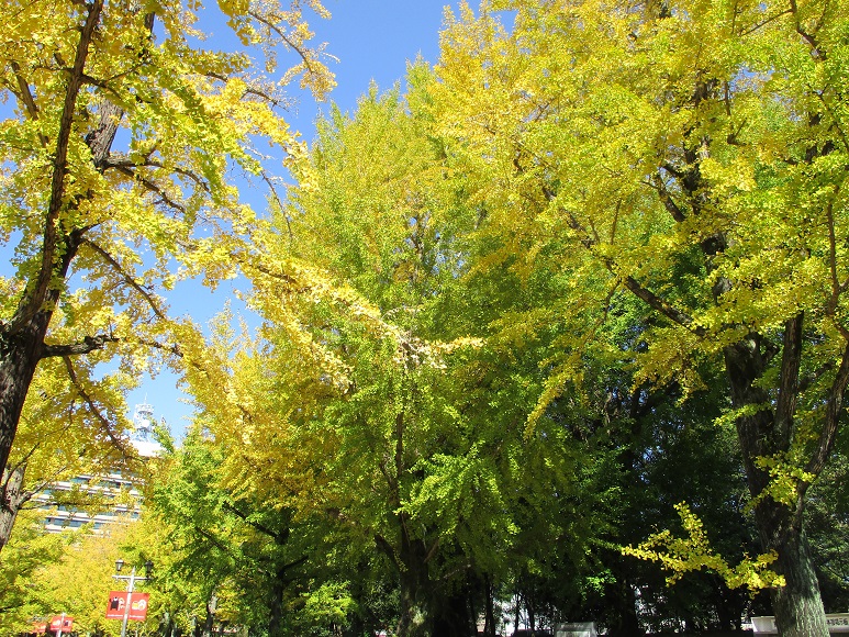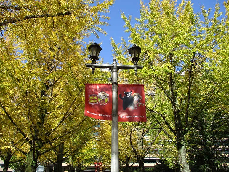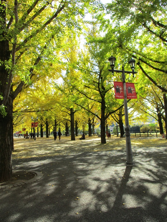 晴天の下 イチョウ輝く 県庁のイチョウ並木は、見頃に行きたいなと思いながらなかなか行けず 今日は長く歩くのを目的に立ち寄ってみたのだけど、 おっ、なんかいい感じじゃないですか よかった~今日行ってみて ルフィにも会えました