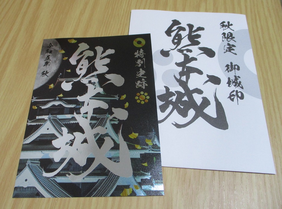 先日ゲットした 秋限定 御城印(黒) 全体の黒に銀杏の金が映えます。熊本城にピッタリ!