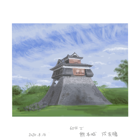 背景練習を兼ね、60分ワンドロに挑戦 去年撮った写真を見ながら、手ブロで描いてみました。 角度が…なんかちがうな? 色選びが難しいなあと思いました。 なんだか思うような濃さにならないんだ… 遠景からと思って空から描いてみたけれど、かなり時間を取られてしまった 参考にした写真はこちら 熊本城 戌亥櫓 2019年10月撮影